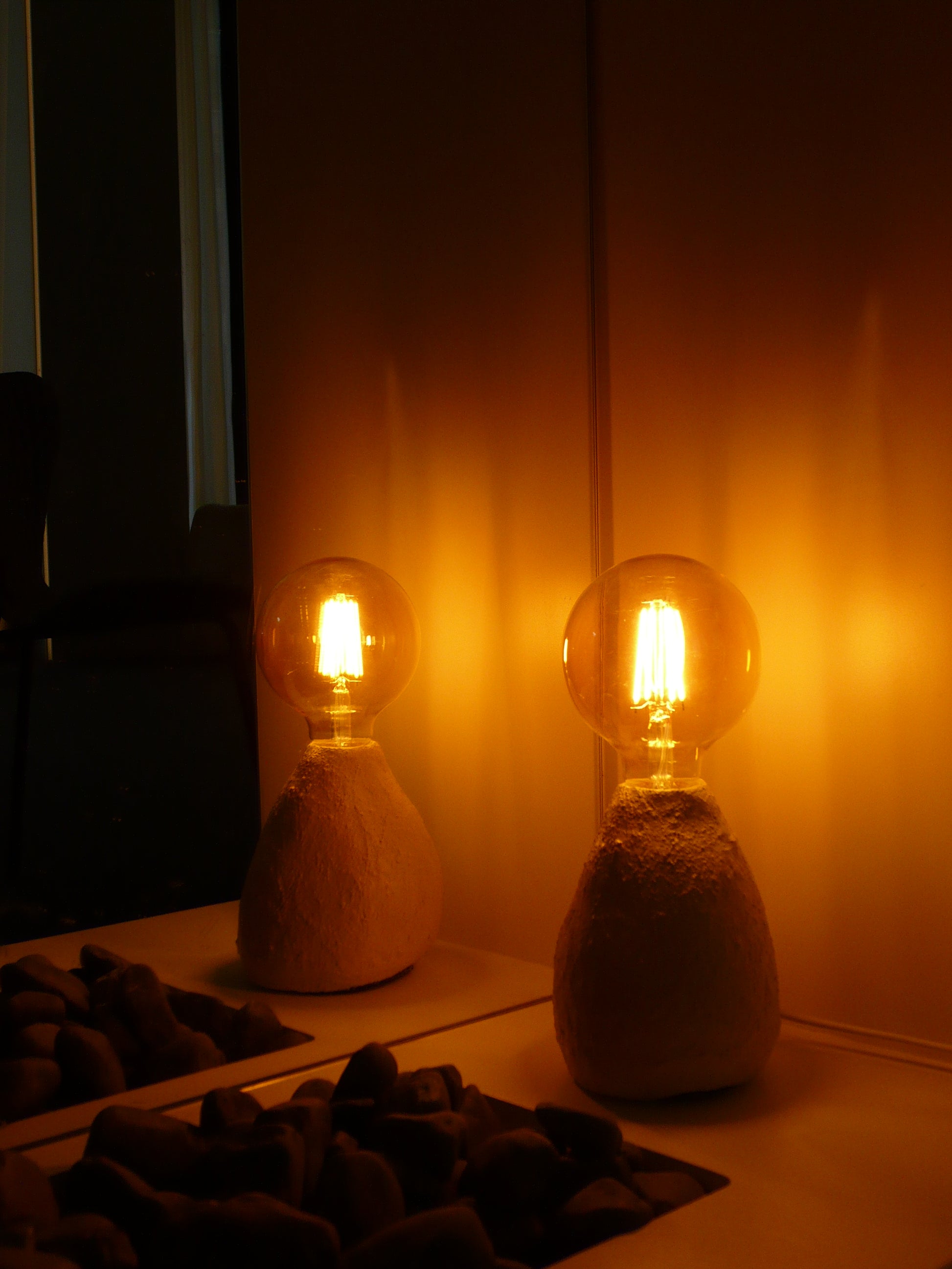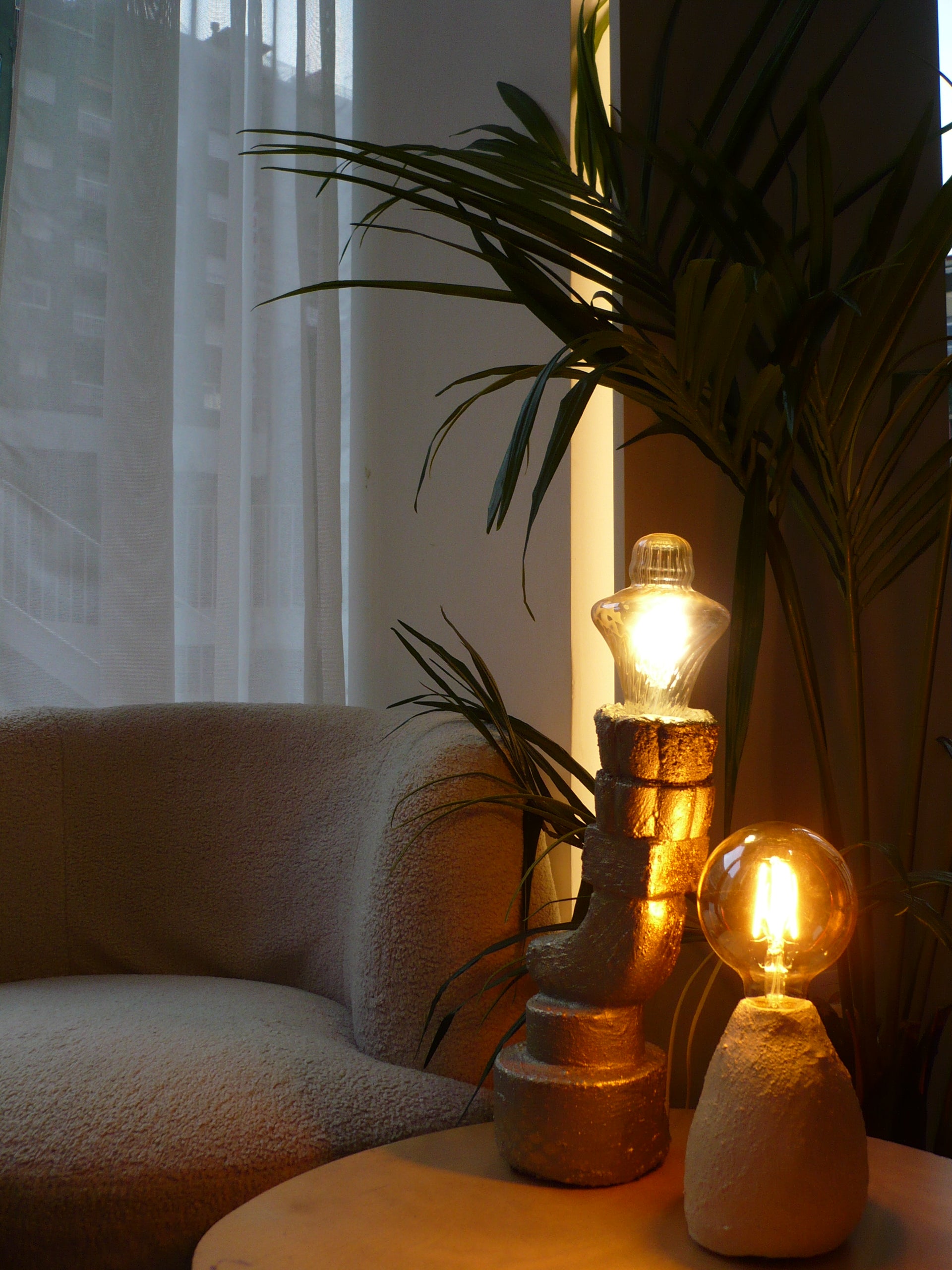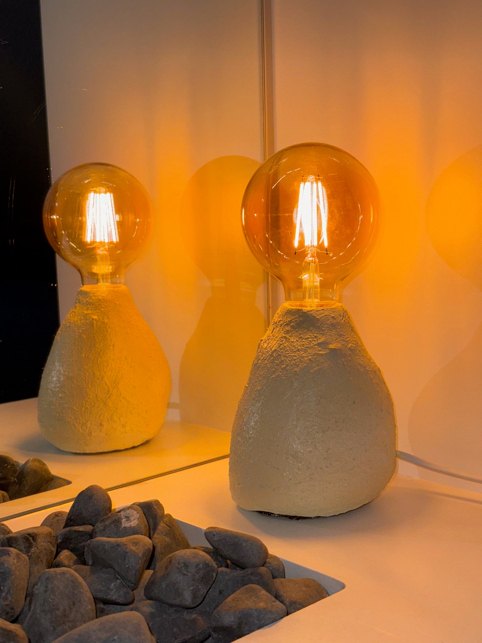 Inspirada en formas orgánicas y creada con plástico reciclado, yeso, agua y pintura. Su luz cálida y su estética única transforman cualquier espacio en un rincón especial.