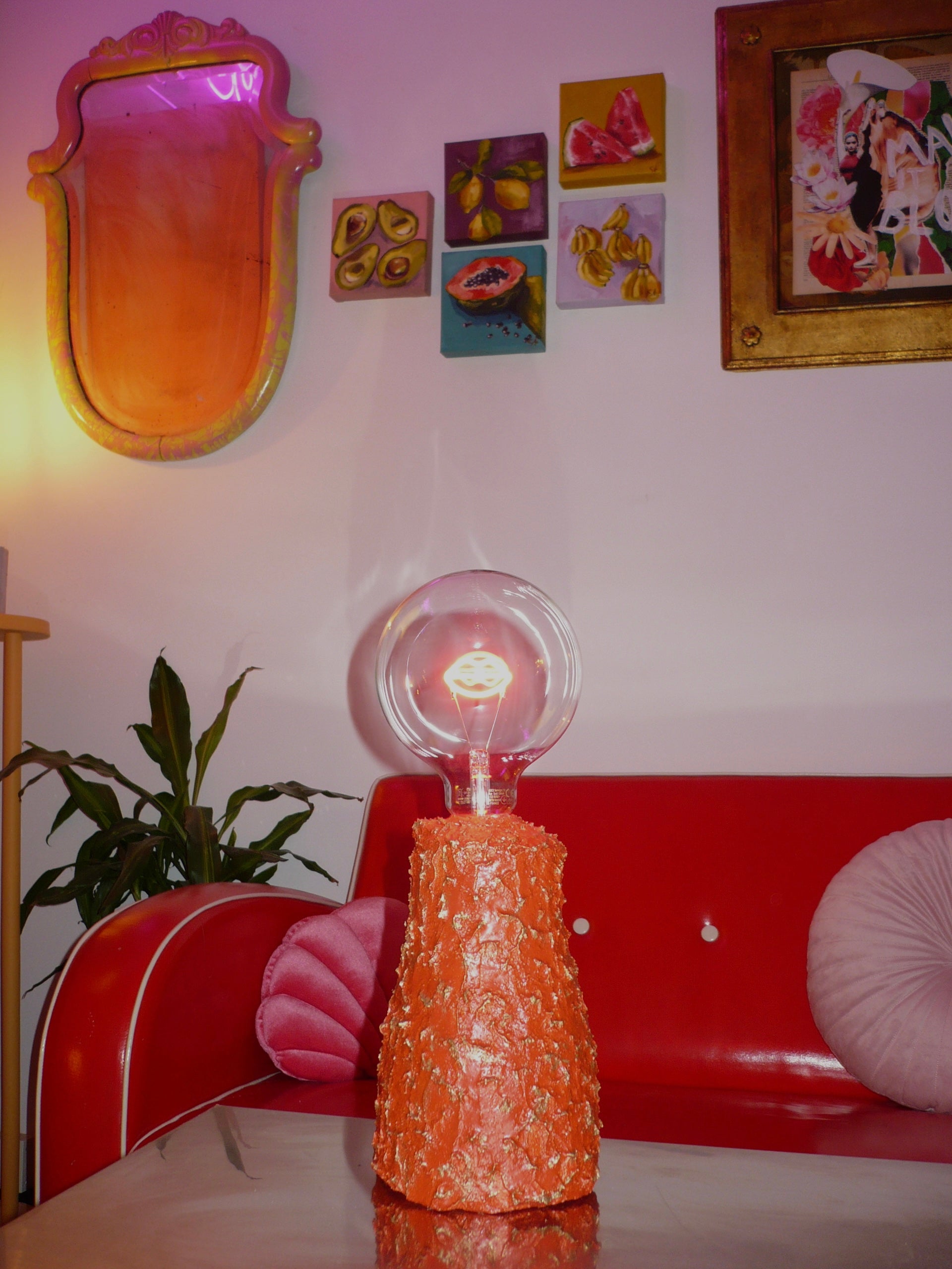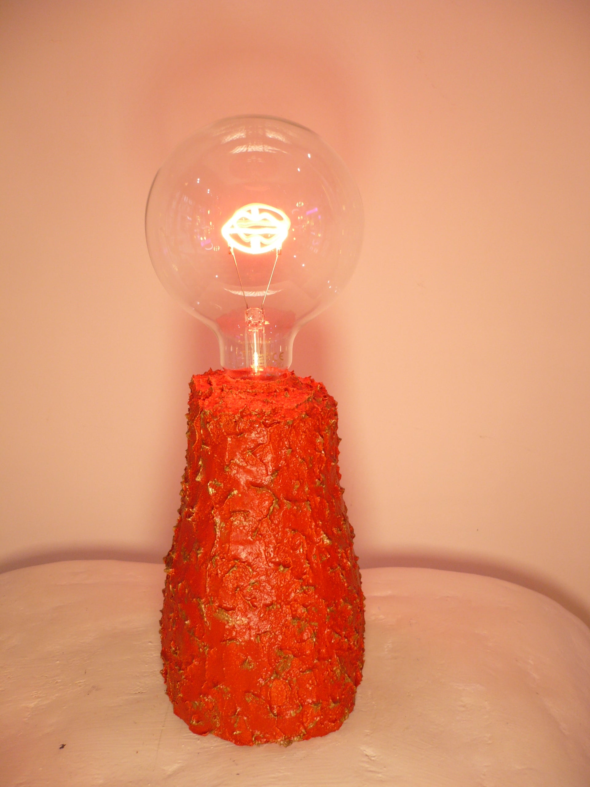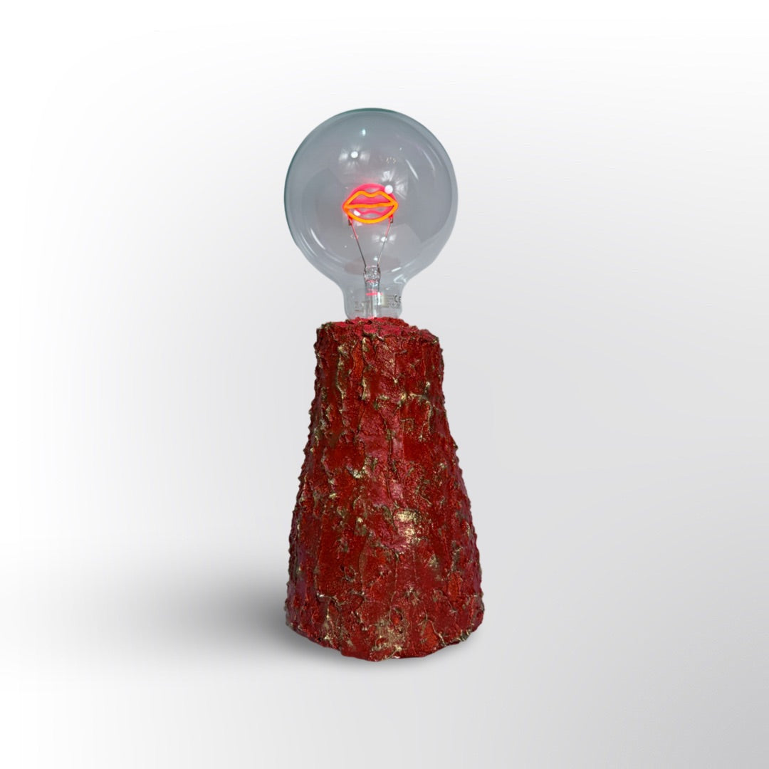 Una pieza única de color vibrante y textura volcánica, hecha a mano con materiales reciclados. Ilumina tu espacio con carácter y un toque audaz de diseño sostenible.