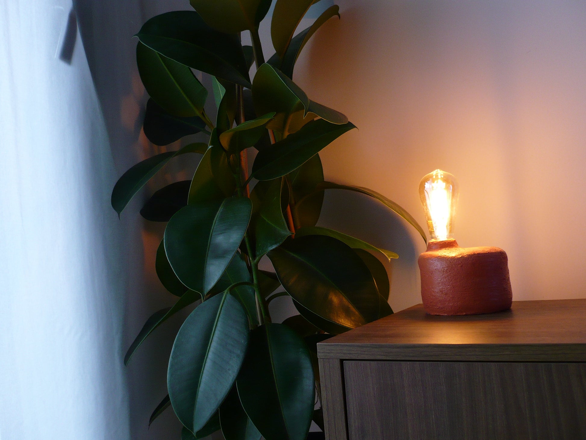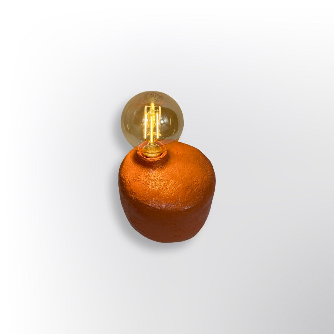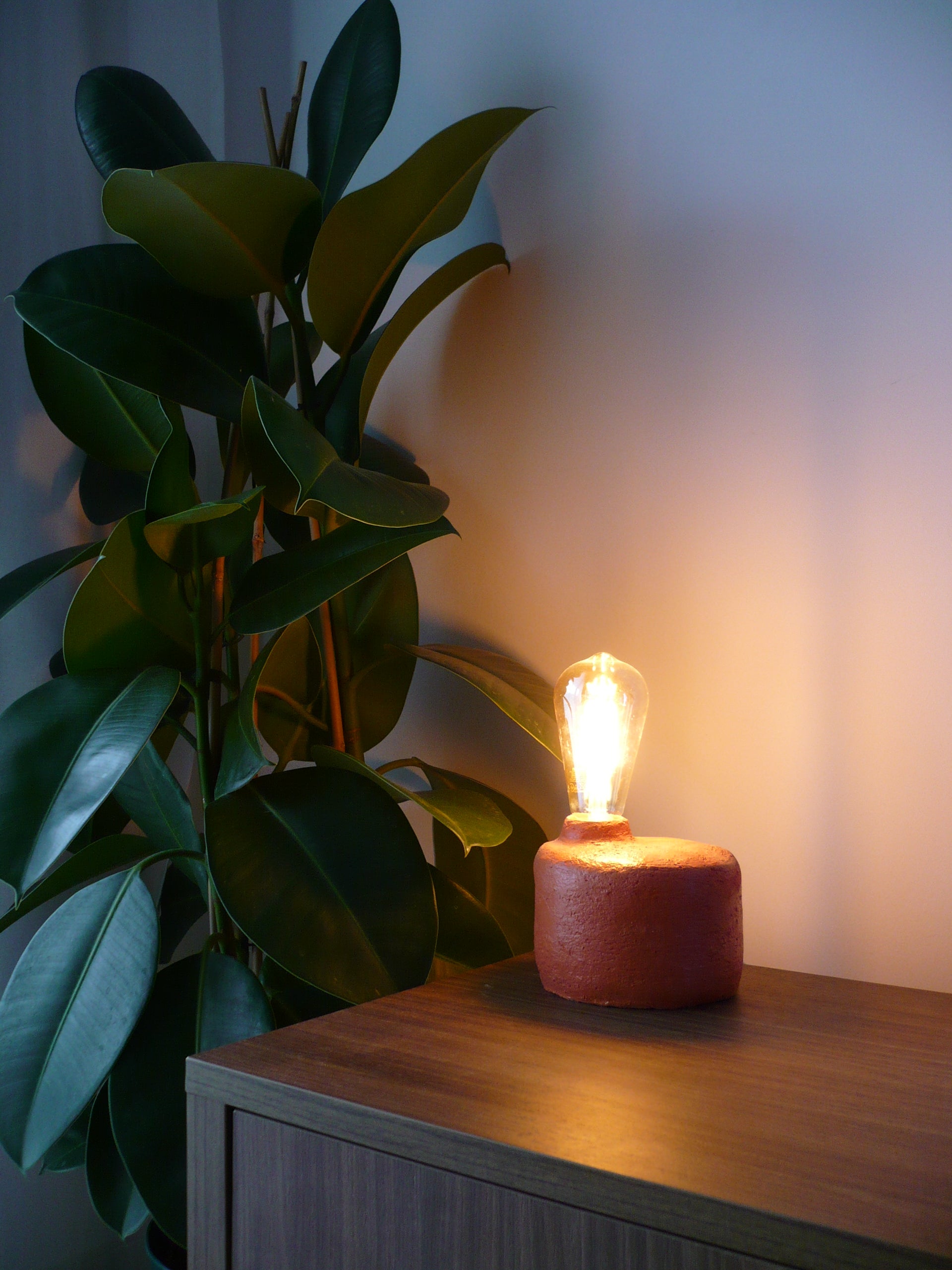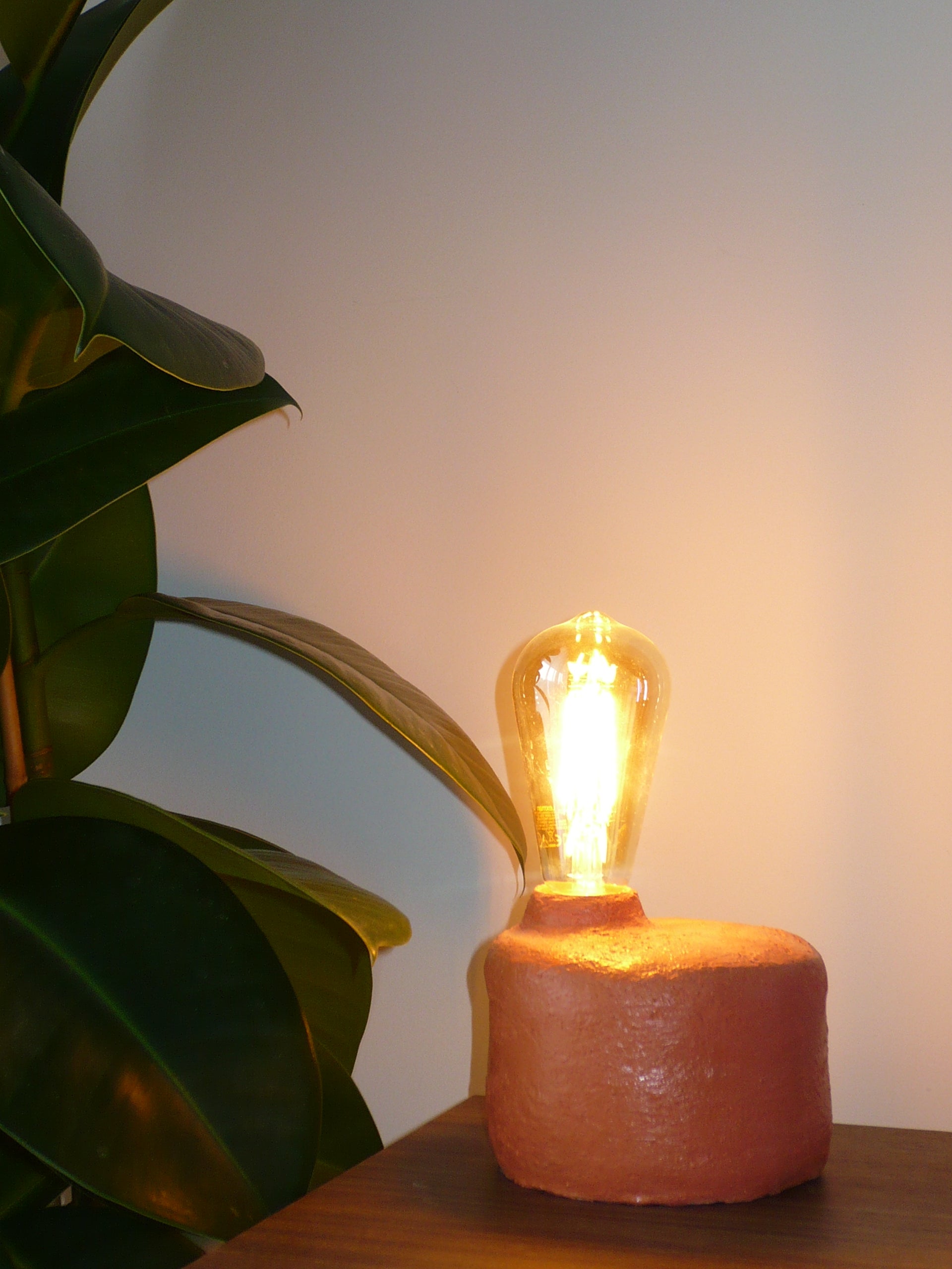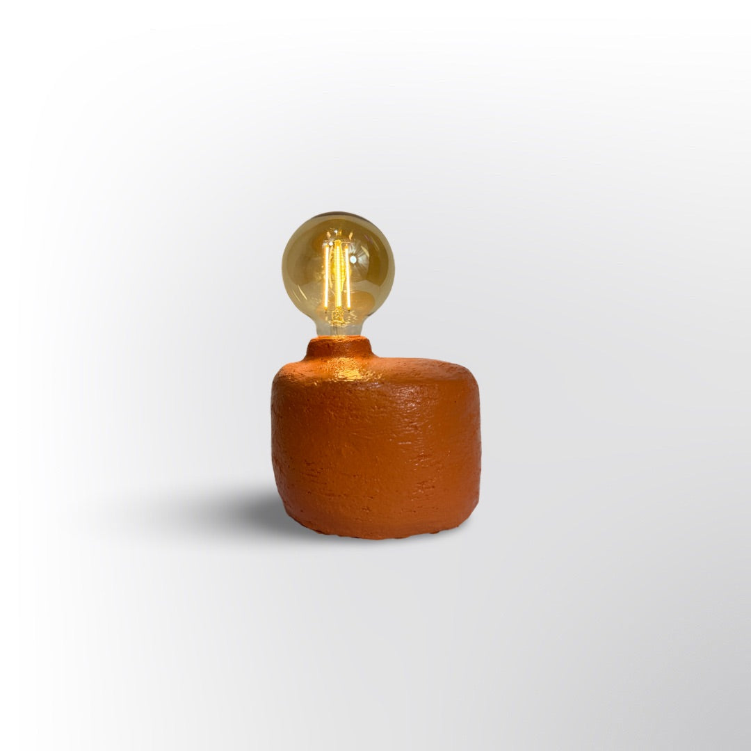 Lámpara artesanal de diseño único, elaborada con plástico reciclado, yeso, agua y pintura. Su base minimalista con acabados cálidos contrasta con una bombilla contemporánea que proyecta una luz suave y envolvente.