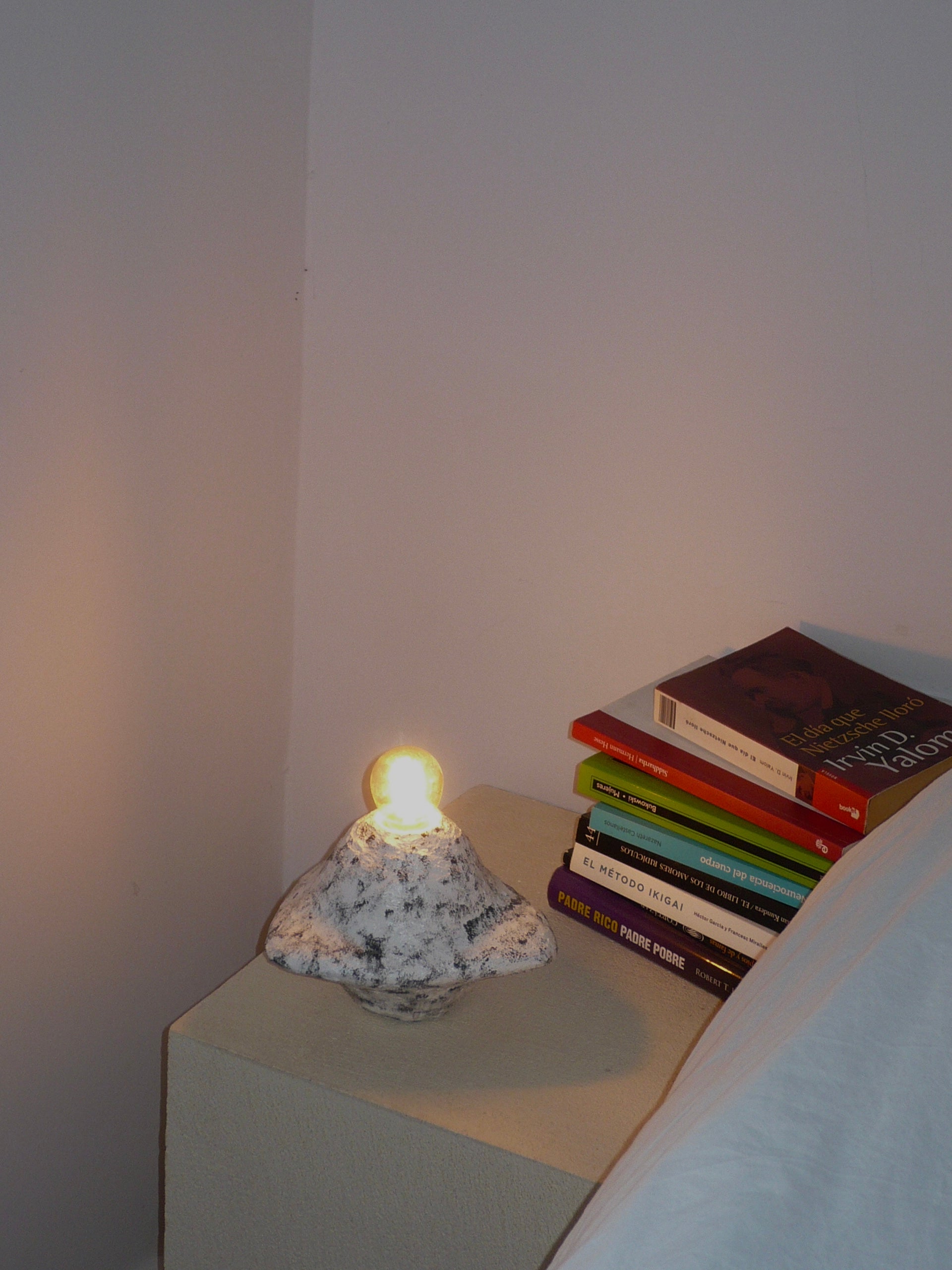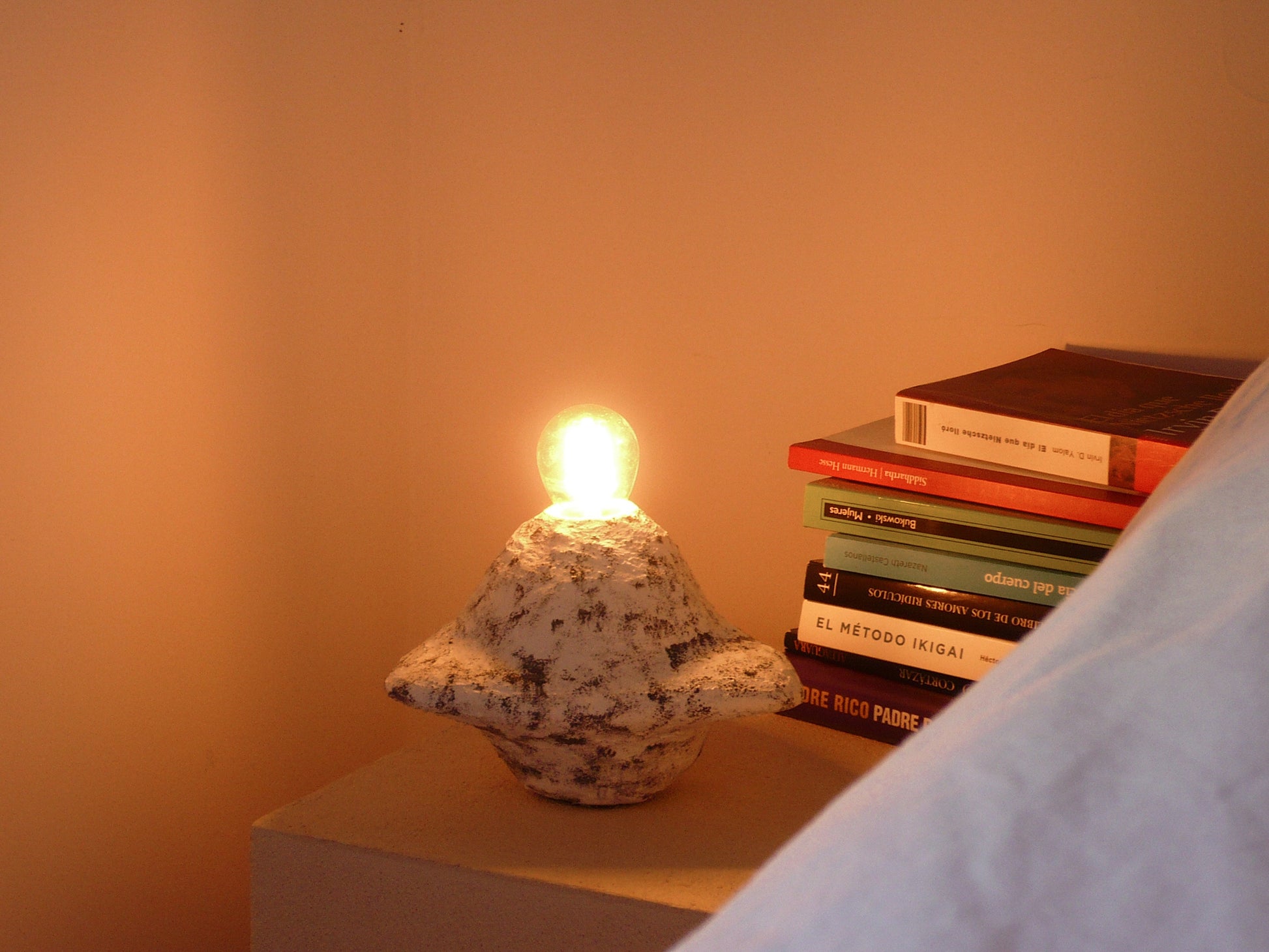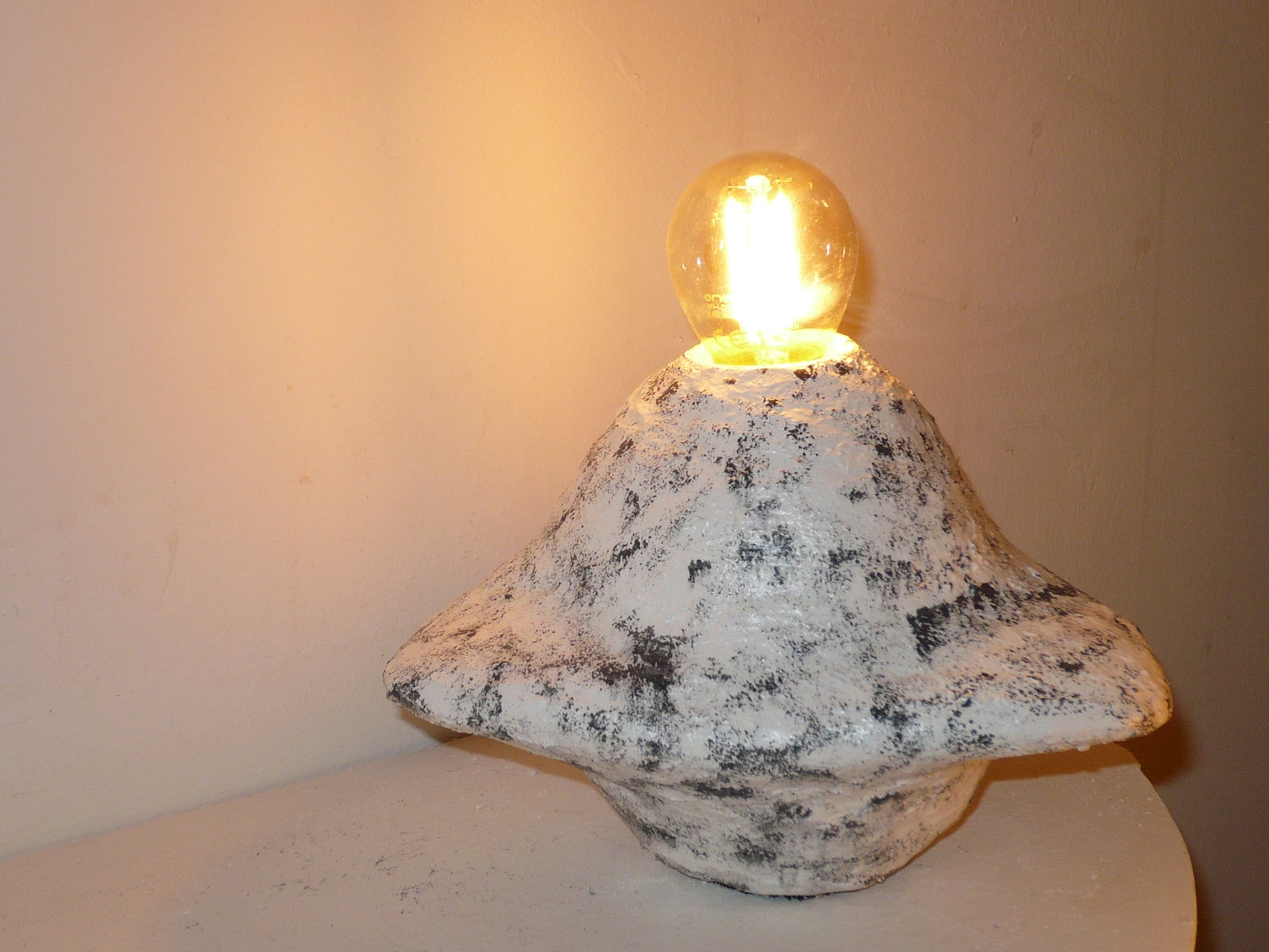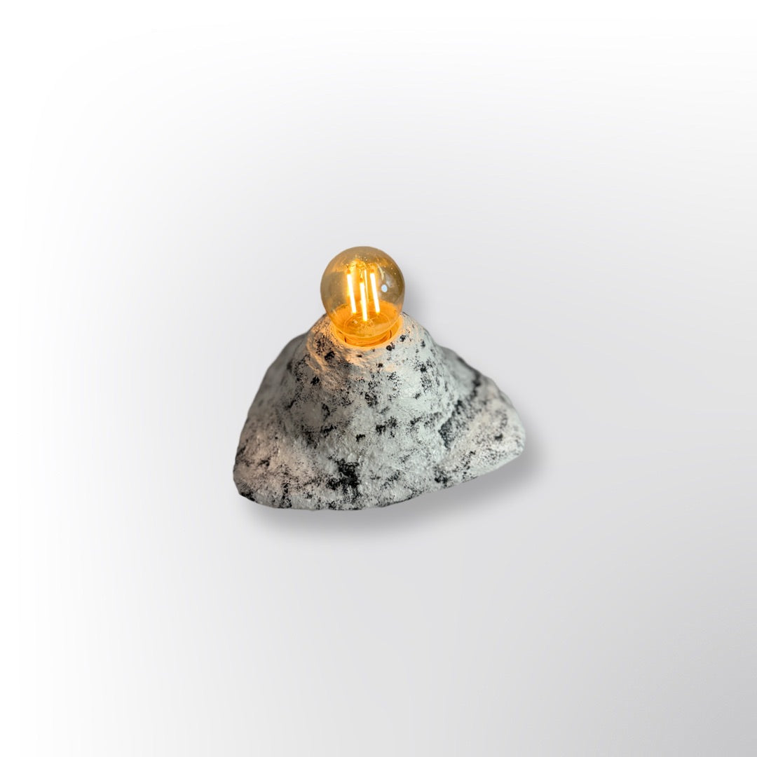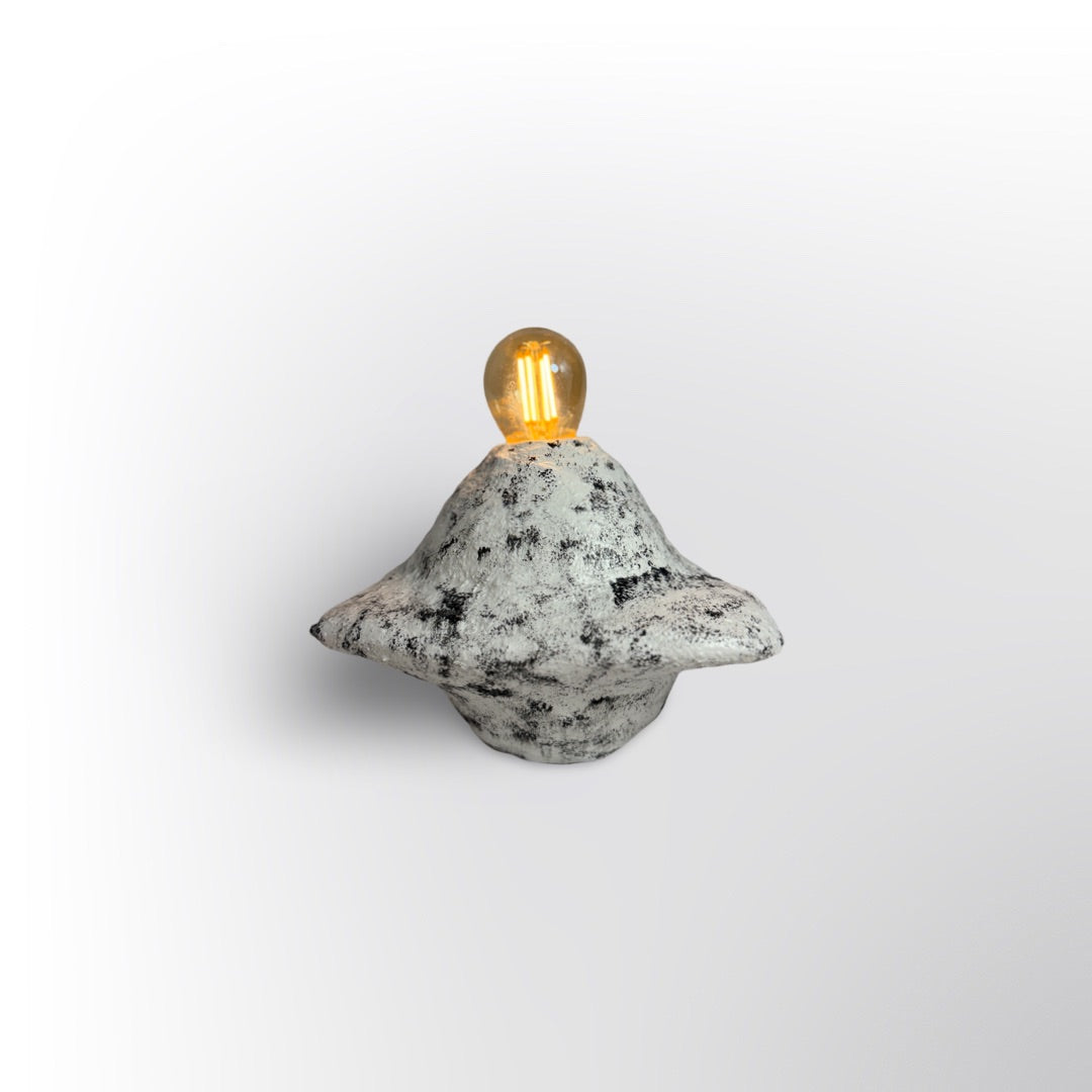 Lámpara artesanal con un diseño futurista y galáctico, elaborada con plástico reciclado, yeso, agua y pintura. Su forma escultórica evoca paisajes cósmicos, mientras que la luz cálida que emite crea una atmósfera mágica y envolvente.