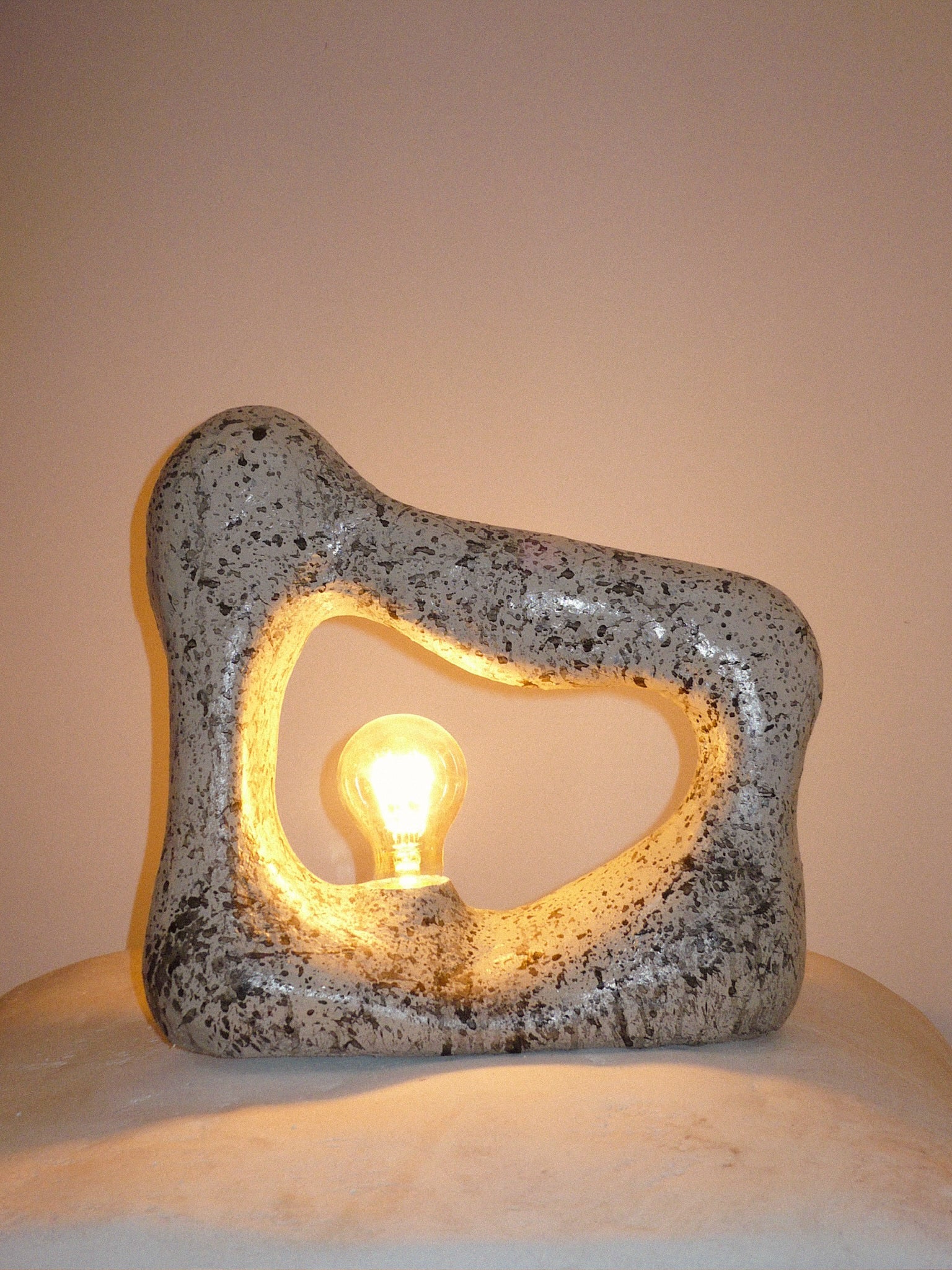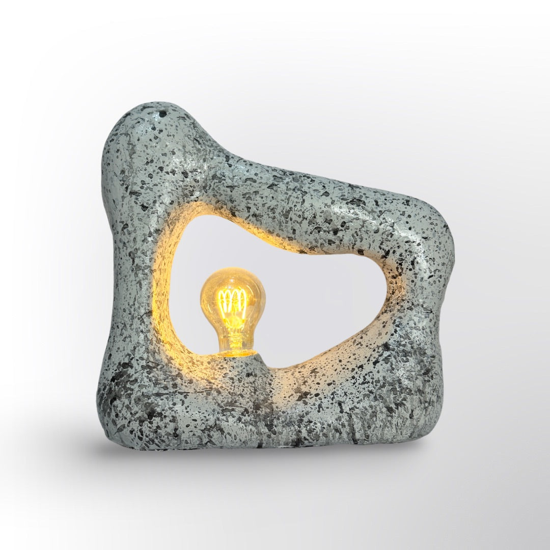 Lámpara hecha a mano con cartón, madera y yeso reciclados. Inspirada en formas orgánicas, su diseño único y textura natural crean una luz cálida y envolvente. Un toque de arte sostenible para espacios con estilo.